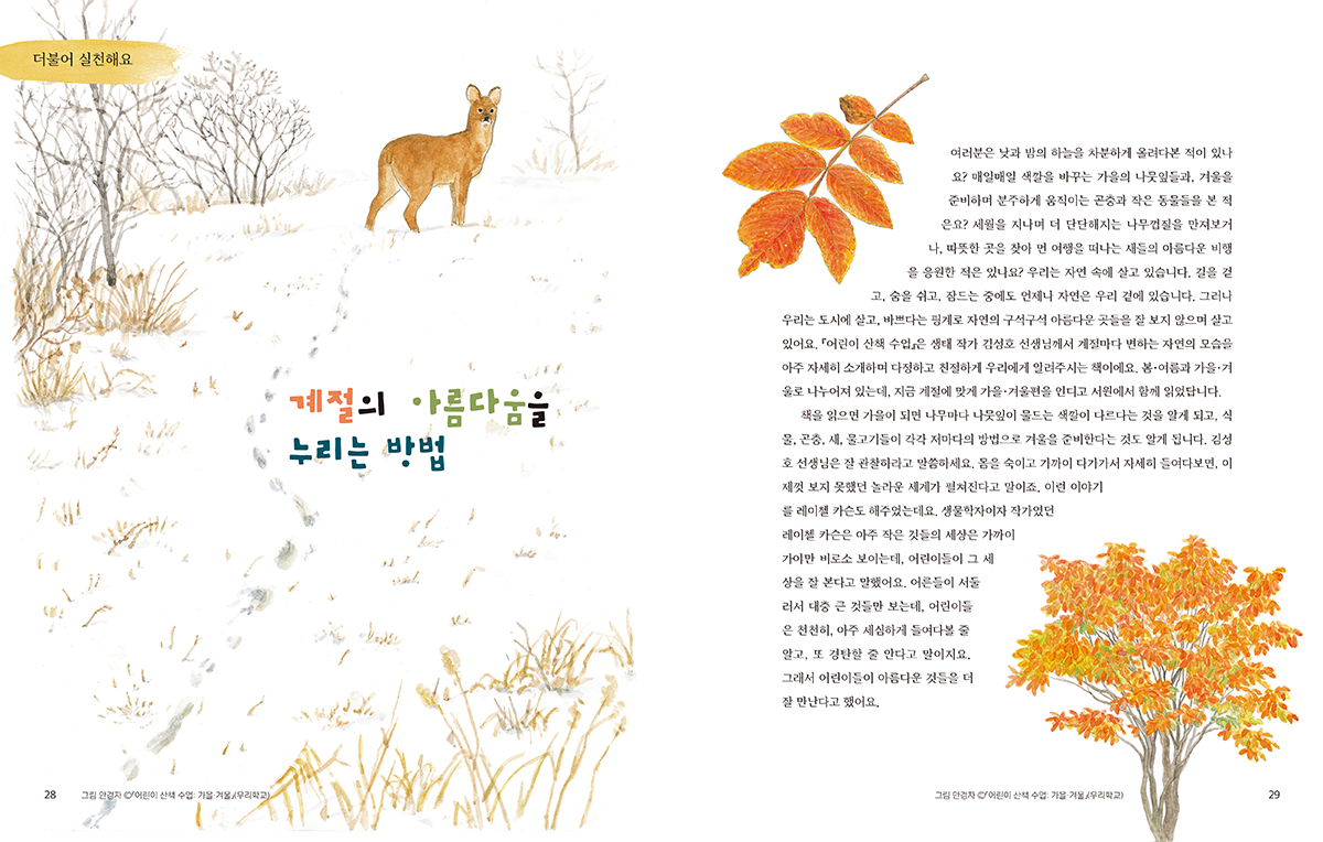 책을 읽으면 가을이 되면 나무마다 나뭇잎이 물드는 색깔이 다르다는 것을 알게 되고, 식물, 곤충, 새, 물고기들이 각각 저마다의 방법으로 겨울을 준비한다는 것도 알게 됩니다. 김성호 선생님은 잘 관찰하라고 말씀하세요. 몸을 숙이고 가까이 다가가서 자세히 들여다보면, 이제껏 보지 못했던 놀라운 세계가 펼쳐진다고 말이죠. 이런 이야기를 레이첼 카슨도 해주었는데요. 생물학자이자 작가였던 레이첼 카슨은 아주 작은 것들의 세상은 가까이 가야만 비로소 보이는데, 어린이들이 그 세상을 잘 본다고 말했어요. 어른들이 서둘러서 대충 큰 것들만 보는데, 어린이들은 천천히, 아주 세심하게 들여다볼 줄 알고, 또 경탄할 줄 안다고 말이지요. 그래서 어린이들이 아름다운 것들을 더 잘 만난다고 했어요.