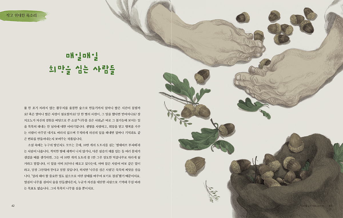 소설 속에는 누구의 땅인지도 모르는 곳에, 10만 개의 도토리를 심는 ‘엘제아르 부피에’라는 사람이 나옵니다. 척박한 땅에 새싹이 나지 않거나, 다른 짐승의 해를 입는 등 여러 문제가 생겼을 때를 생각하면, 그는 이 10만 개의 도토리 중 1만 그루 정도만 떡갈나무로 자라게 될 거라고 말합니다. 이 일을 이미 3년이나 해오고 있다는데, 아마 많은 사람이 바보 같은 일이라고, 당장 그만둬야 한다고 말할 것입니다. 하지만 ‘나무를 심은 사람’은 묵묵히 씨앗을 심습니다. “달리 해야 할 중요한 일도 없으므로 이런 상태를 바꾸어 보기로 결심”했기 때문이지요. 열심히 나무를 심어서 숲을 만들겠다든지, 누군가 자신을 대단한 사람으로 기억해 주길 바라는 목표도 없습니다. 그저 묵묵히 나무를 심을 뿐이지요.
