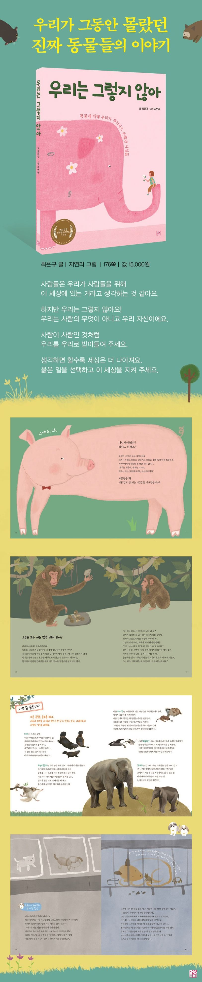 우리는 흔히 돼지가 먹을 것밖에 모르고, 더럽다고 생각합니다. 하지만 정말 그럴까요? 실제 돼지는 목욕을 아주 좋아하는 청결하고 영리한 동물이랍니다. 그뿐만 아니라 무섭게 느껴지는 늑대의 하울링 소리는 사실 대화하는 소리이고, 원숭이들은 부모를 잃은 어린 원숭이를 다른 원숭이가 자기 자식처럼 키우기도 하는 등 동물들의 세계는 우리의 상상보다 훨씬 따뜻하고 체계적입니다. 우리의 편견과 상식을 뒤엎는 지혜로운 동물들의 메시지를 함께 읽어보세요! 이들과 어떻게 함께 살아가야 할지 저절로 답을 알게 될 거예요.