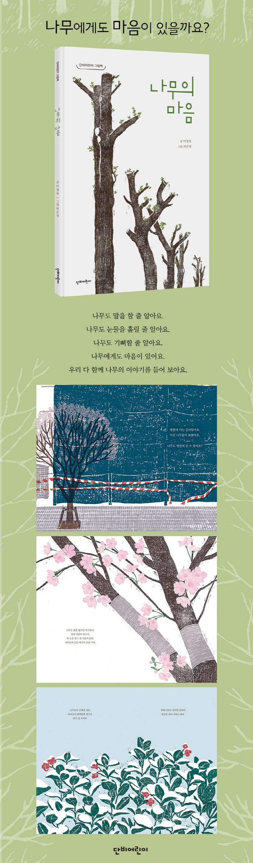 우리 주변에는 아주 많은 나무가 있어요. 학교, 길, 집 앞 등 걸어 다니면서 심심치 않게 볼 수 있는 생명이죠. 여름에는 뜨겁게 내리쬐는 햇볕을 막아주고, 비가 오면 우리가 젖지 않게 비를 막아주는 역할도 해주는 매우 고마운 존재예요. 여러분은 혹시 나무가 아프면 병원에 갈 수 있다는 사실을 알고 있나요? 나무 또한 살아가는데 물이 필요하고 아프면 치료할 수 있는 약이 필요해요. 우리는 느끼기 힘들지만, 나무도 마음을 갖고 있다고 작가는 이야기합니다. 우리도 나무의 마음을 더 잘 알기 위해서 이 책을 읽어보면서 얘기해보면 어떨까요?