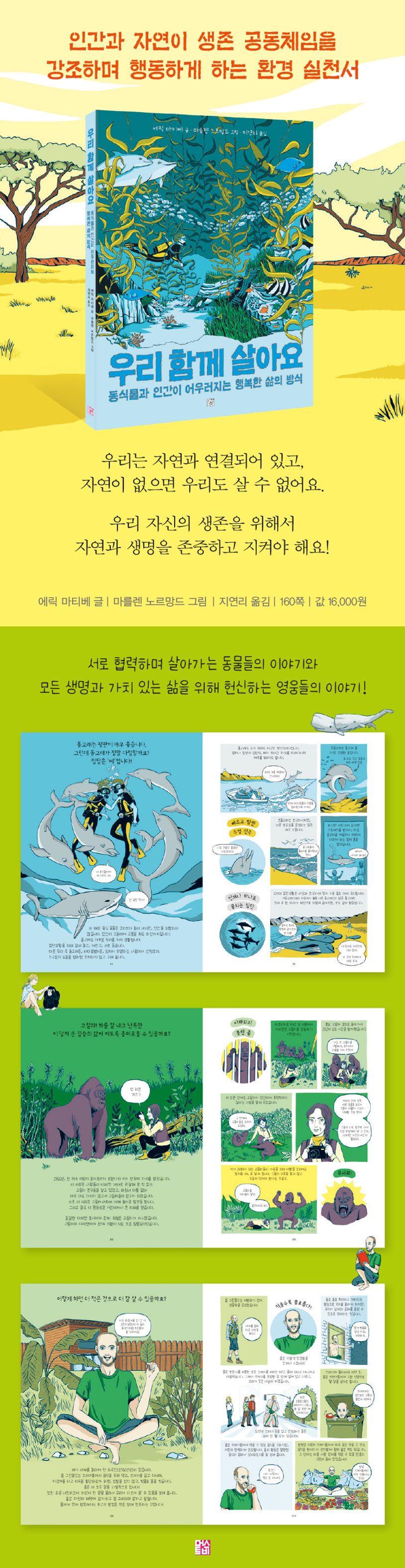 지구에는 인간을 포함한 많은 종류의 생명체들이 함께 살아가고 있어요. 인간과 동물, 식물 등 자연이 지금까지 파괴되지 않고 같이 살아올 수 있었던 이유는 공생의 관계를 취했기 때문이에요. 어느 한쪽으로 치우치지 않고 어떻게 하면 같이 살아갈 수 있을까를 고민했기 때문이지요. 하지만 인간이 자본주의 사회로 접어들면서 돈을 벌기 위해 동식물들이 살아가는 환경(자연)을 파괴하기 시작했어요. 자연이 파괴된다면 과연 인간들은 잘 살아남을 수 있을까요? 이 책을 읽으면서 왜 자연을 지켜야 하는지, 또 그 방법은 무엇인지 생각해 봅시다.