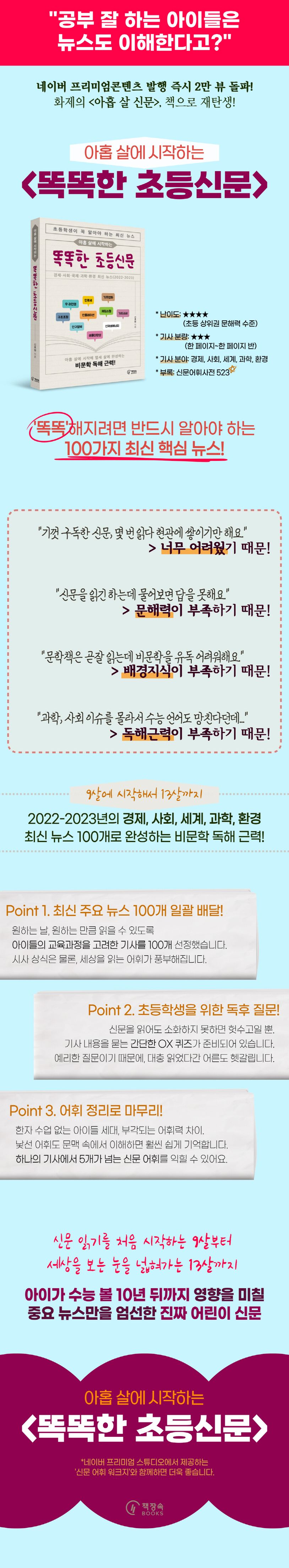 세상의 다양한 소식을 알 수 있을 뿐 아니라, 읽기 실력까지 길러주는 신문! 여러분은 신문을 자주 보시나요? 신문은 어른들이 보는 어려운 것으로 생각하지는 않나요? 그래서 신문이 낯설거나 멀게 느껴졌다면 이 책을 펼쳐보세요. 신문 읽기를 처음 시작하는 어린이를 위해 준비한 이 책은, 뉴스를 이해하기 위한 배경지식에 대한 설명과 어려운 어휘에 대한 설명, 잘 읽었는지 확인할 수 있는 퀴즈와 부모님과도 함께 이야기 나눌 수 있도록 중요한 토론 주제도 제시하고 있습니다. 경제, 사회, 세계, 과학, 환경 등 관심 분야를 넓혀보고, 깊이 있는 대화를 위해 곰곰이 생각해 보는 습관을 함께 길러볼까요?