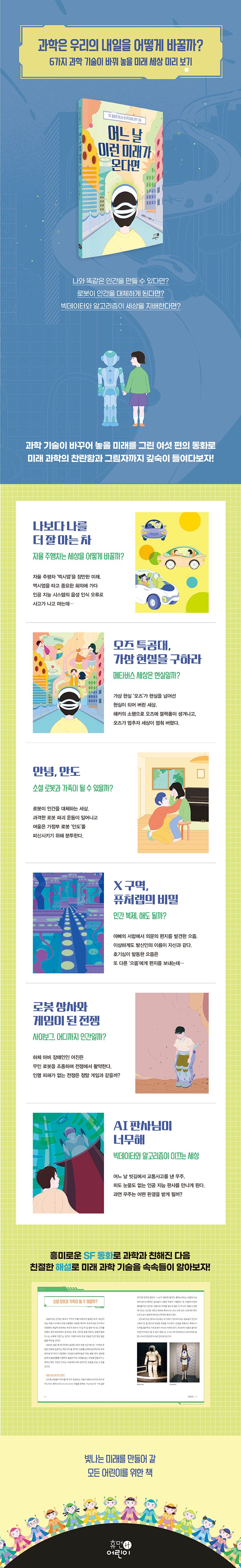 날마다 새로운 과학기술이 나타나는 오늘날, 우리는 과학기술을 모두 안전하고 효과적으로 잘 다루고 있는 걸까요? 이 책에서는 자율 주행차, 메타버스, 알고리즘, 인간 복제, 사이보그, 빅데이터 등 이미 우리 사회에 큰 영향을 끼치고 있는 과학기술을 소재로 한 여섯 편의 SF 동화가 펼쳐집니다. 편리하게만 보였던 과학기술을 잘못 사용하게 되었을 때, 우리는 어떤 위험에 빠지게 될까요? 과학기술의 어두운 면까지 상상해 보며 행복한 미래를 만들기 위해 과학기술을 발전시킬 때 어떤 시선과 태도를 가져야 할지, 우리가 함께 의논해 결정해야 할 문제들은 무엇일지 생각해 봅시다.