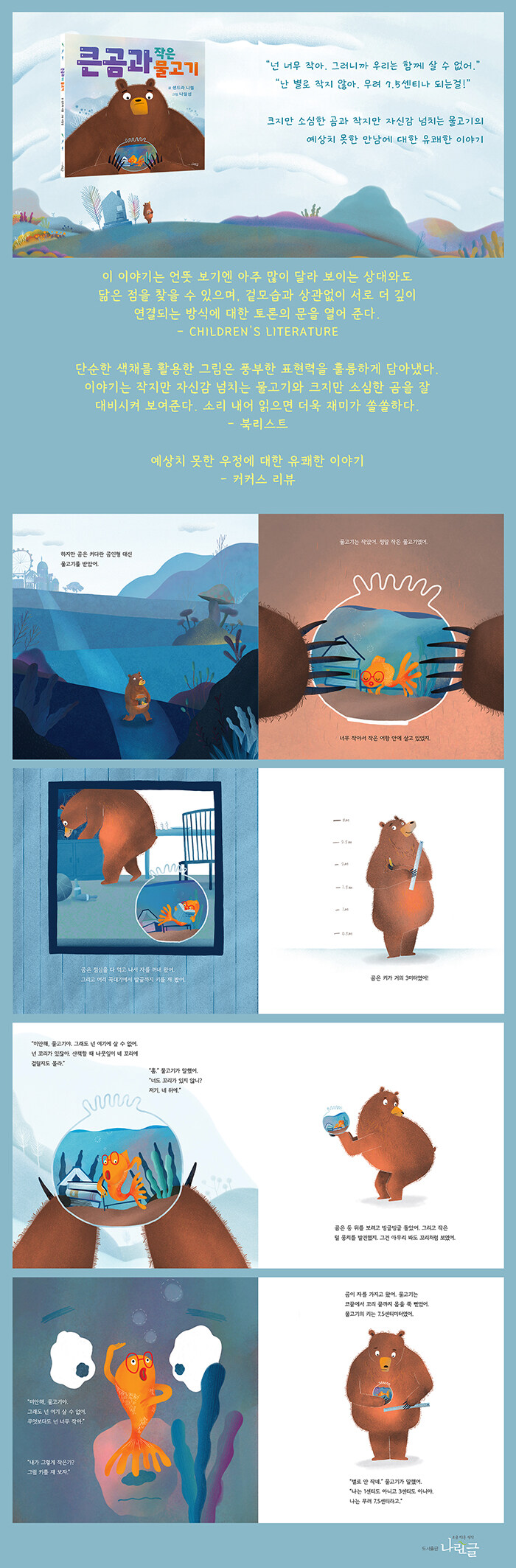 축제에서 곰은 상품으로 커다란 곰인형을 갖고 싶었습니다. 그냥 곰인형이 아니라 가장 큰 곰인형 말이에요. 하지만 곰이 받은 건 아주 작은 물고기였습니다. 실망한 곰과 작은 물고기의 대화를 들으며 세상에 정말 크고 넓은 게 무엇인지 생각해봅시다.